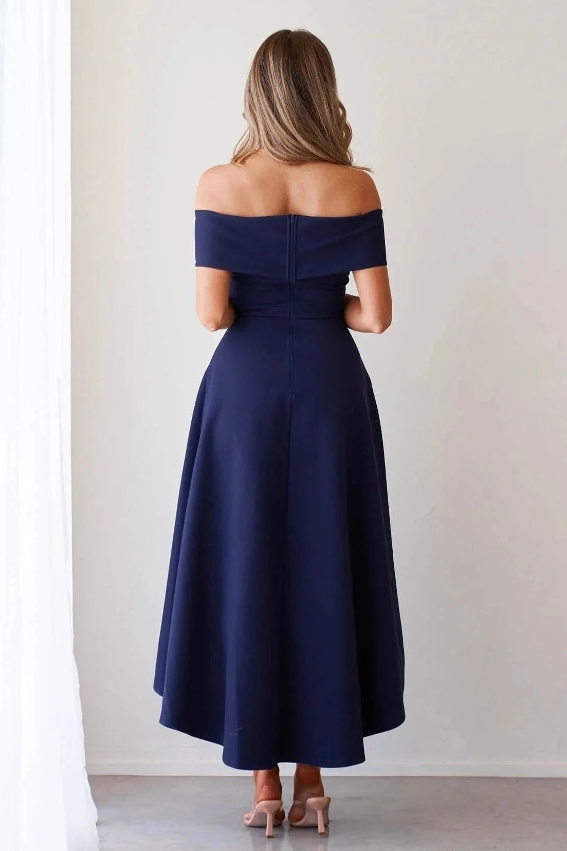 The Belina Dress is not simply a dress - it is an embodiment of exquisite sophistication. Its off-shoulder design drapes delicately over your collarbones, promising to entice and mesmerize all those who catch a glimpse. The A-line skirt, flowing effortlessly from the waist, bestows a sense of grace and poise upon your every movement
